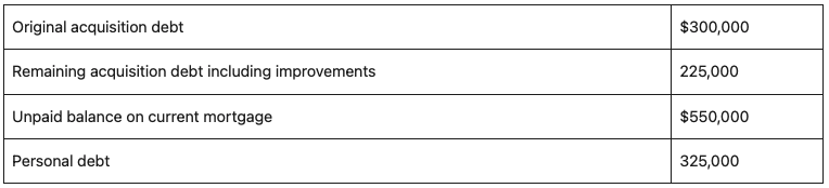 Original acquisition debt$300,000Remaining acquisition debt including improvements225,000Unpaid balance on current mortgage$550,000Personal debt325,000